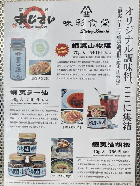 卓上調味料豊富。オリジナルものは蝦夷◯◯として販売してる。田中義剛を連想したのでちょっとマイナスのスタート。