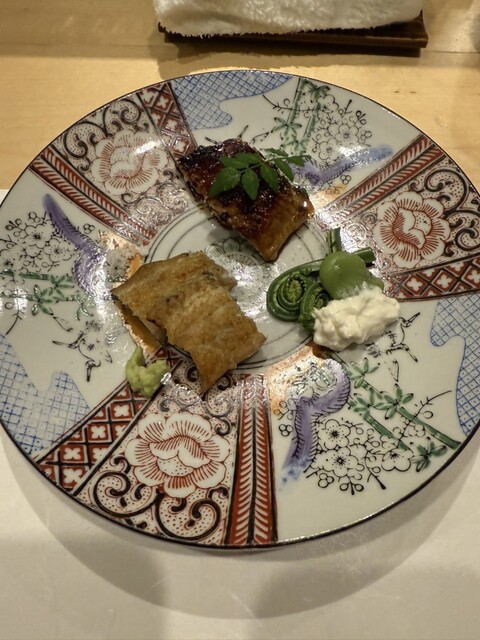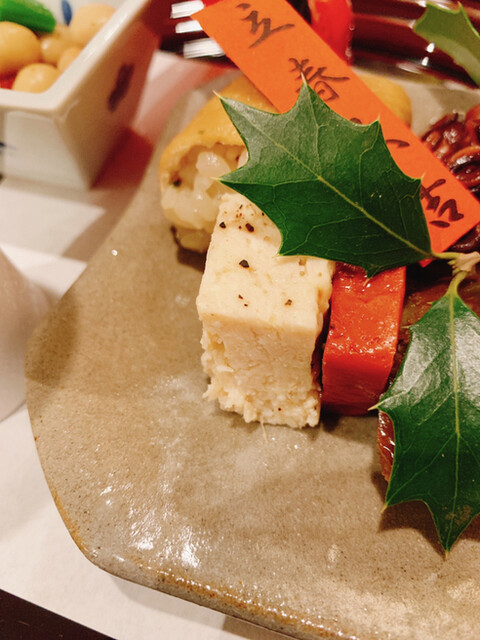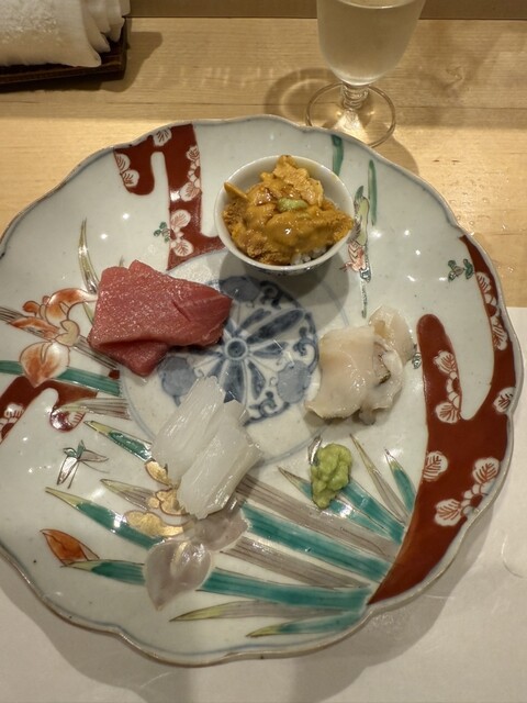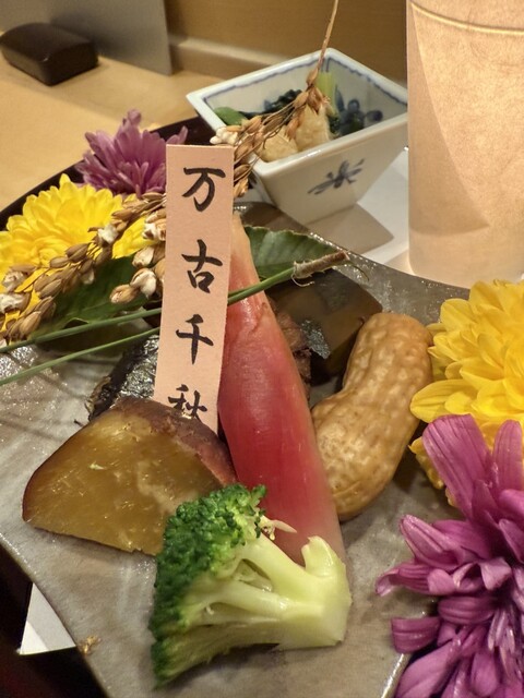 八寸。 カワハギ肝ポン酢和え、鱒のいくらとほうれん草のお浸し、ニシンの甘露煮、牛蒡、半生カラスミ、ブロッコリー、カリフラワー、カボチャのブランデー煮、石川の蒟蒻、あと3品は覚えられませんでした