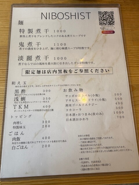 限定メニューは、昼間に食べているので、夜はレギュラーメニューから淡麗煮干、鬼煮干を注文しました。