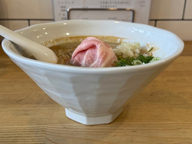 トッピングは、レアなチャーシュー、海苔、ネギ、タマネギです。