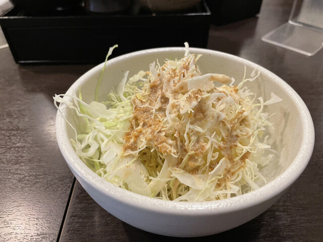 先にキャベツ千切りが提供されたのでテーブルにあったゴマドレッシングをかけていただき待ちました。