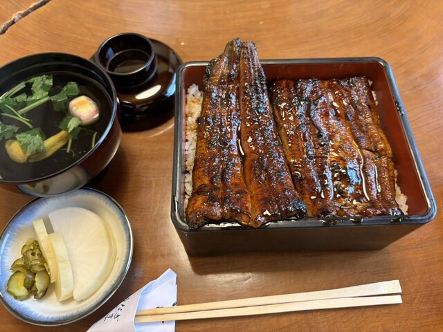 うなぎ:直重(重箱のご飯に鰻が乗りタレがたっぷり)肝吸い・糠付けお新香