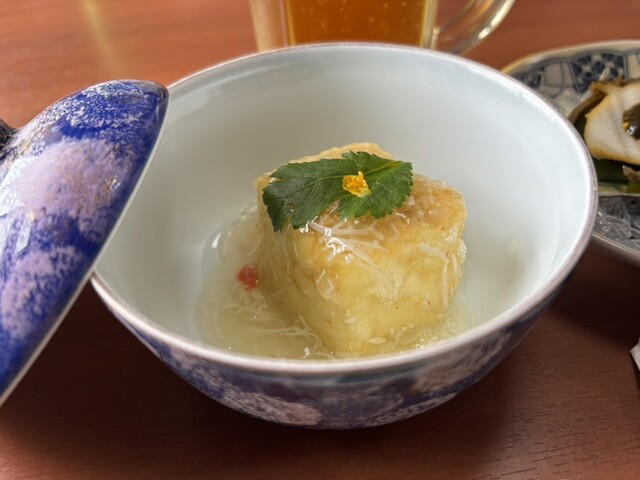先付けの「カニ酢」「餡かけ揚げ豆腐」からスタートです。