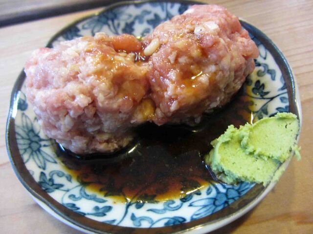 提供されたつくねはタレの中に浮かんだ確かに生のタタキ。