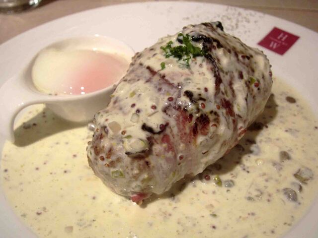 ハンバーグは岩中豚のベーコンをまいたパンチェッタベーコンにして、もちろん温泉玉子つき。