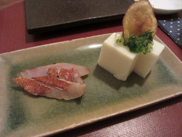 蕗味噌豆腐、子羊、しいたけ、あさり、プチトマト、穴子、アスパラ、小鴨、ハス、蟹、銀杏、