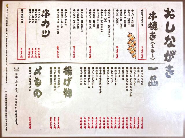 おつまみは 豚の串焼き をメインに、串カツ、煮込み、唐揚げなどを提供しています。