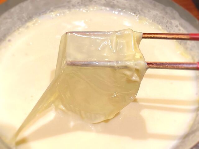 卓上コンロで九州産大豆を使った豆乳を温めて出来上がった湯葉を掬います。