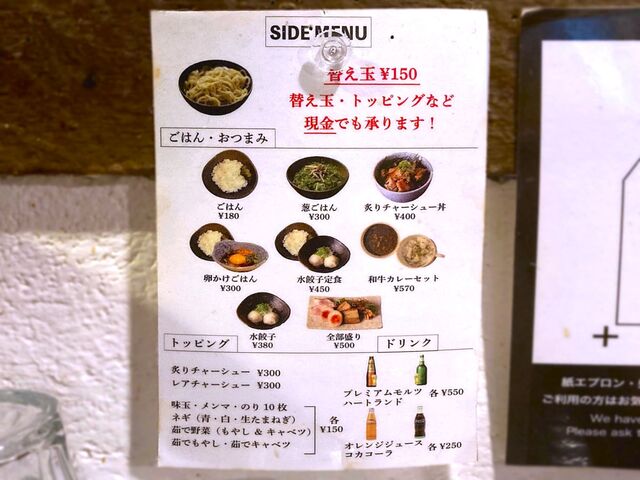 メニューは らーめん、つけめん、汁なし があり、その他ご飯ものなどのサイドメニューがあります。
