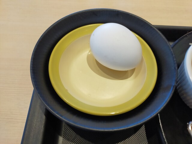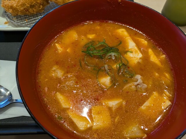 券売機で購入して店内へ。席に着いて待ちます。番号が呼ばれ受け取りに。キムチチゲ、アジと牡蠣のフライ、そして生卵。どうやっていただくのが筋なんだろうという代物。まずはアジフライ。醤油でいただきます。いいですね。みそ汁代わりにチゲ。これもあり。続いてカキフライ。半分かじったつもりが、中身が付いてきてしまって後半は衣だけいただくことに。そして最後は残ったチゲに生卵投入。結構おいしくいただきました。ご馳走様でした。
