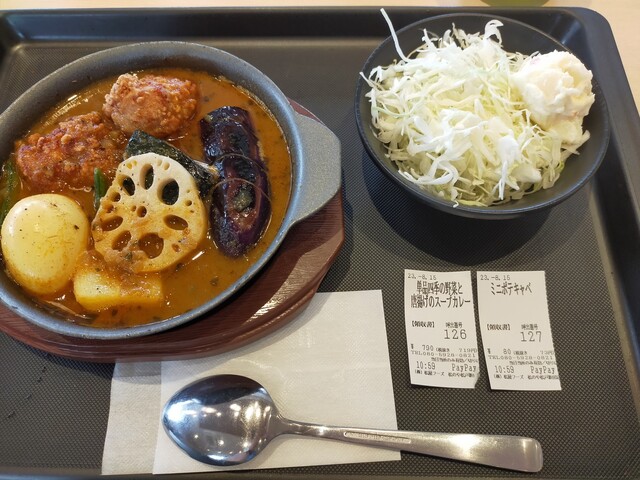 四季の野菜と本格唐揚げのスープカレーとミニポテキャベ