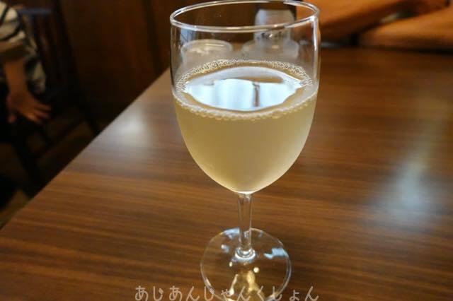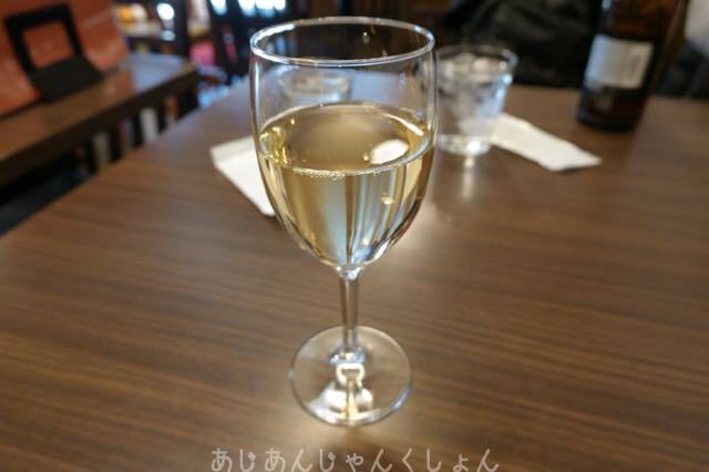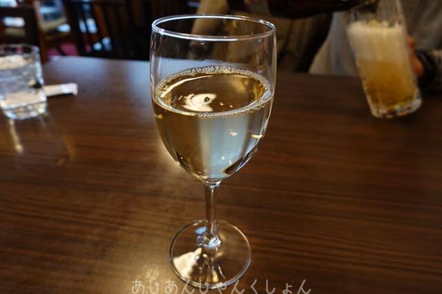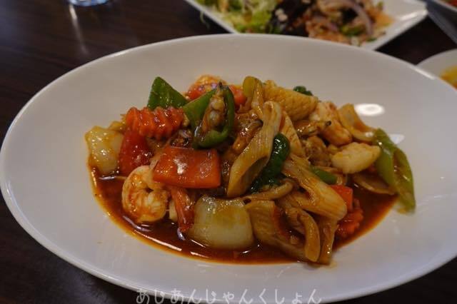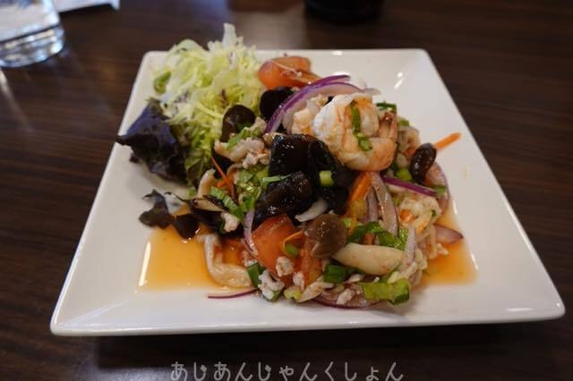 海鮮ヤムサラダ、キノコ甘辛炒め、海老のタイ風オムレツを友人とシェアする。酒は白ワイン。