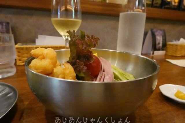 冷やし中華とスパイスチャーハンのセットを量少なめでそれに冷たい白ワイン。