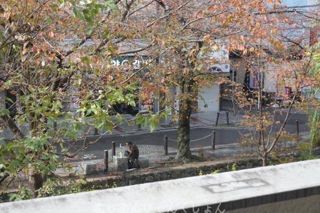 2階から下をみると、もう終わりかけた紅葉の下で、カップ酒を持ってまったりしてはる方がみえた。