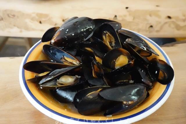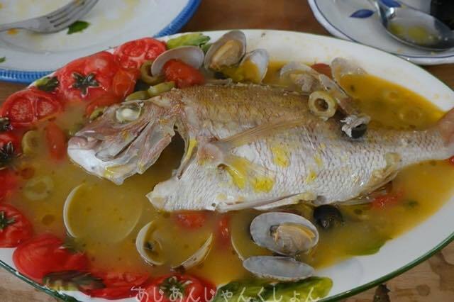 前菜盛合わせ、ムール貝の白ワイン蒸し、鮮魚のアクアパッツァ、それに白ワイン。