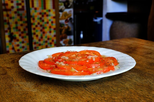 火曜日の昼に伺って「さっぱりトマトサラダ」と「カリー」3種(カシミール・サグマトン・シーフード)に「ナン」を頂き満足し満腹となる。