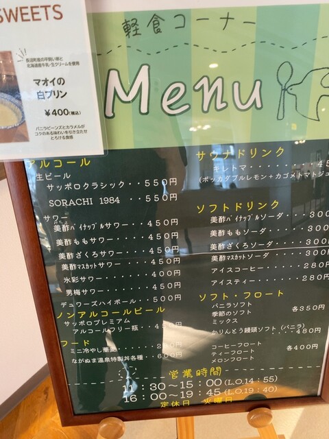 アルコール、ノンアルコールビール、ソフトクリーム、ソフトドリンクなどが販売されています。
