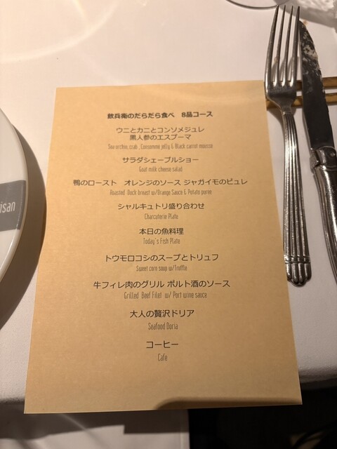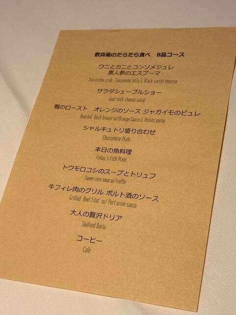 呑兵衛のためのコースという事で確かにお酒に合う味が多かったが女性が上品に食べるというニーズにも確実に答えられるフレンチのテイストをしっかり残したコース。