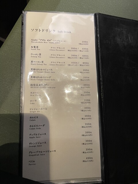 ドリンクは、ジンジャーエール390円、黒酢はちみつソーダ390円、アサヒゼロ ノンアルコール590円。