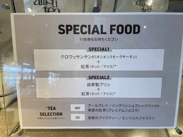 サラダ6種、グリーンサラダ、スコーン、本日のスープ(ほうれん草)、ソフトドリンクにスペシャルフードがどちらか一品(プリンかクロワッサンサンド)