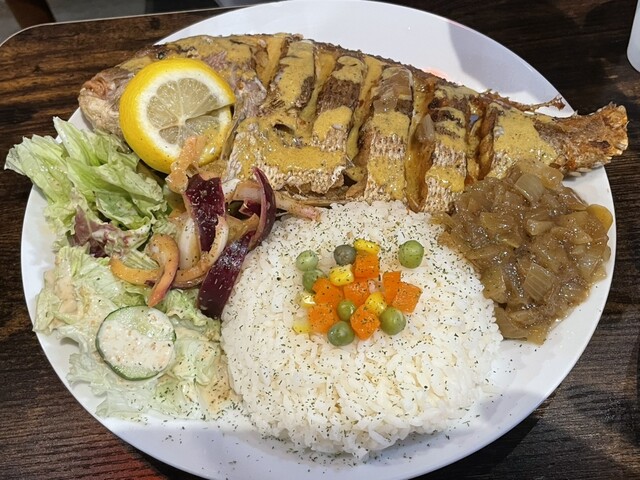 魚料理・・・・揚げたタイ。皮がパリパリで身がふんわりで美味しい。