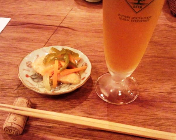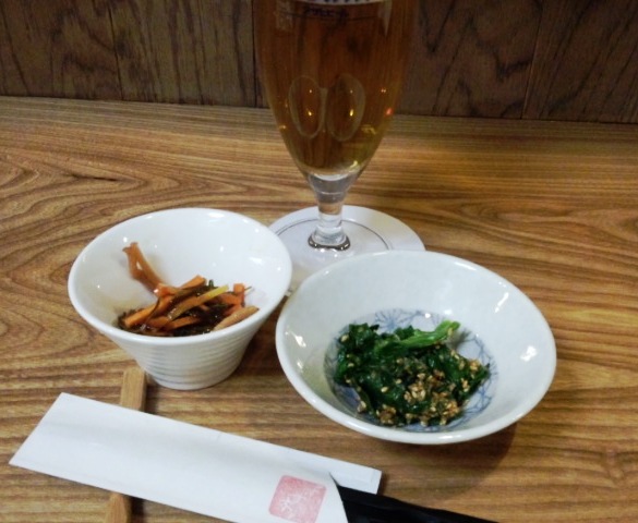 生ビール/小(通常350円/ラリー特典で無料)と一緒にお通し(200円)がだされた。