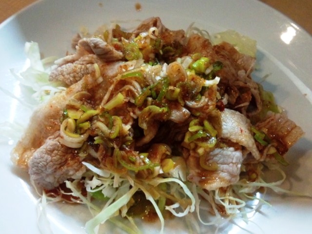 千切りキャベツに蒸した豚肉がのっていて、上からニンニクとネギの醤油系ソースがかかっていた。
