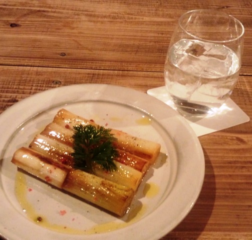 これはもう少し野菜のメニューをいただこうと、焼き葱のマリネ(380円)と黒糖焼酎の由羅王(600円)をロックで追加する。
