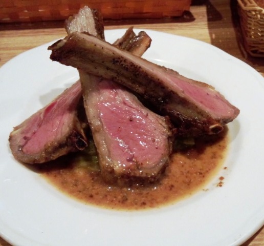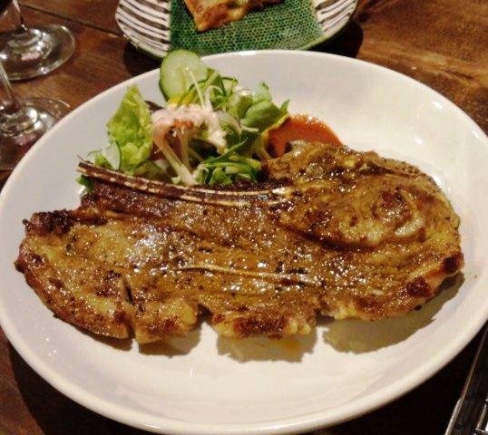 さらにワインのボトルをお替りし、ビーンズサラダ(450円)、骨付きマトンカルビステーキ(580円)も頼む。