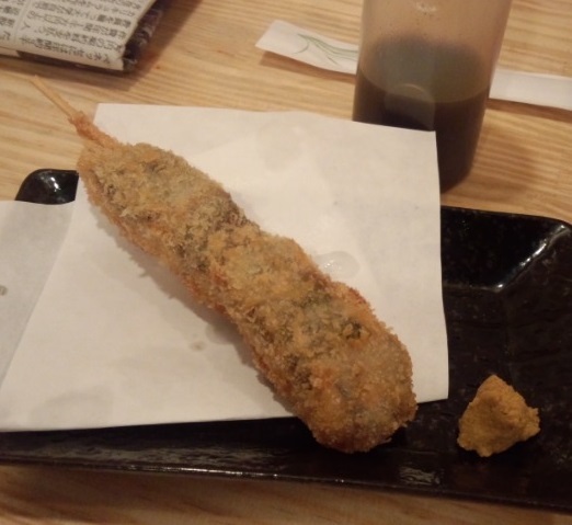 アジの串揚げはかなりの肉厚で衣が薄い。