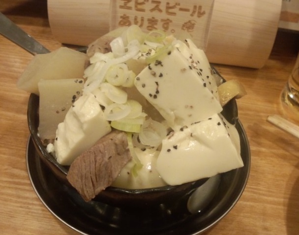 ナカ(税込280円)をお替りしつつ豆腐煮込み/小(税込380円)を追加する。
