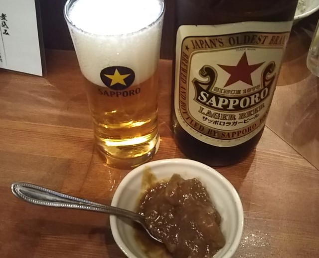 手始めの中瓶ビール(550円+税)は、サッポロラガーとアサヒスーパードライの二種類。
