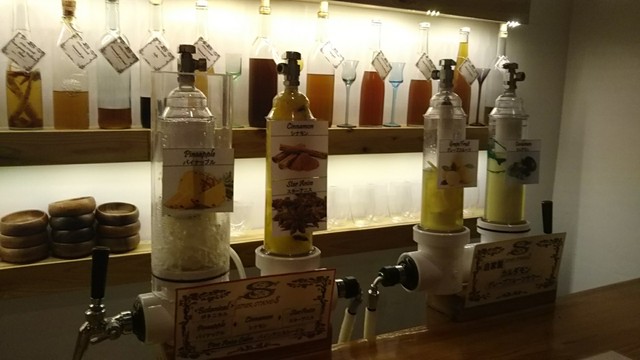 棚には色取り取りの自家製リキュールが並んでるし、