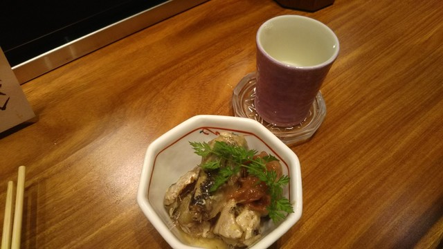 イワシの旨煮(税込380円)と日本酒/文佳人をグラス(税込450円)で追加する。