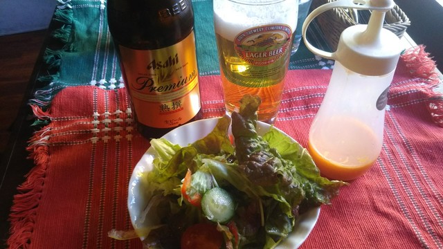 勝利の美酒をランチにセットのサラダと共にいただいた。