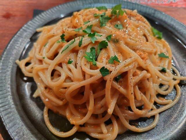 ペペロンチーノと言うよりクリームパスタみたいな感じですがウニが濃厚で美味しいです。