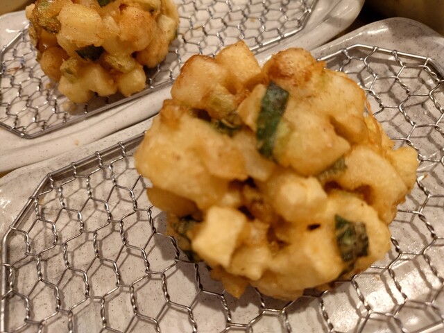 最後は貝柱と蓮根と小松菜のかき揚げです。