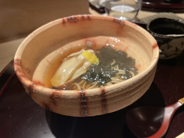 温かい牡蠣蕎麦、からすみがけ、山椒のカレーライスをお願いする。
