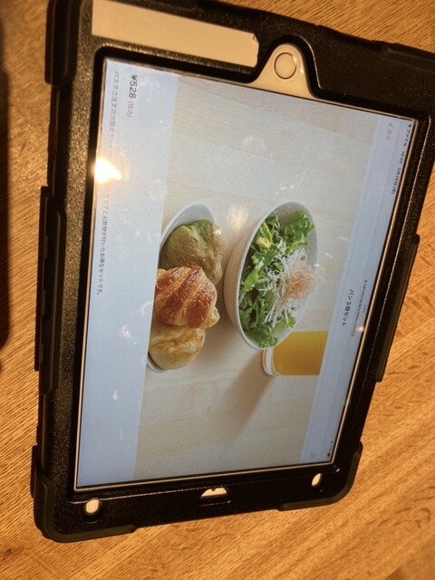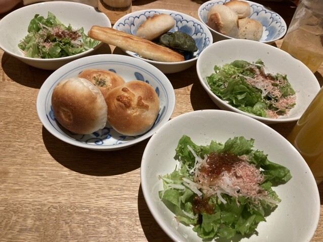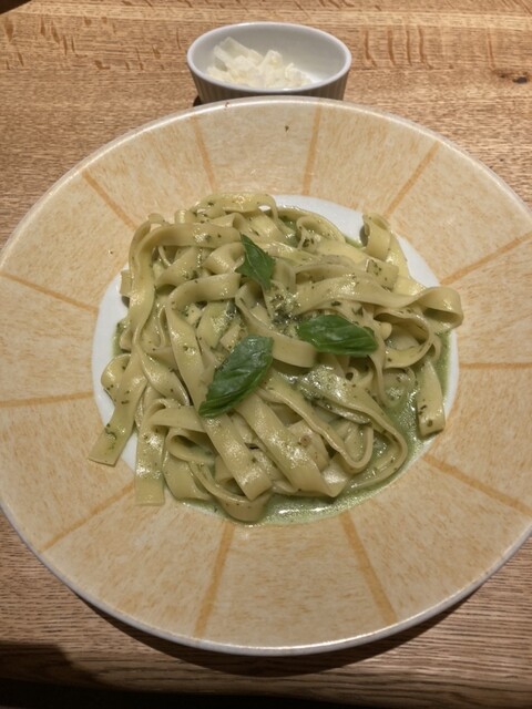 ソファー席を選択したら、靴を靴箱に入れて席に着いた。席はテーブルかソファー、小上がり(畳敷き)があった。BGMはジャズがかかっていた。バリューセットで約1,500円。料理はジェノベーゼペコリーノ添え(麺は通常のパスタかフィットチーネか。フィットチーネを選択)にパン3個セット(チーズ、ガーリック、メンタイコを選択)、ジャコのサラダ、飲み物オレンジジュースを選択。)。注文はタブレットで行う。料理の提供時間は早い。空いていたのか注文してから10分かからなかった。