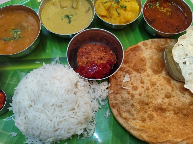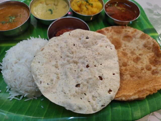 提供されたミールスはワダやプーリーまで乗った豪勢な仕様。