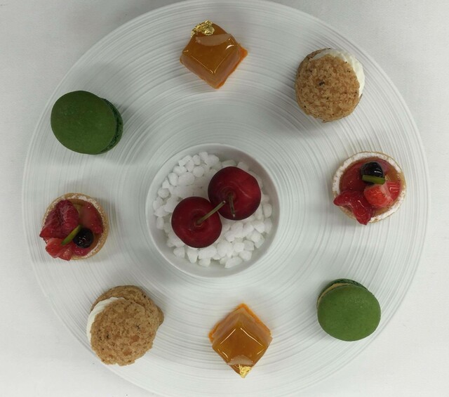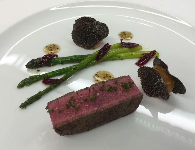熊本産あか牛フィレ肉のロティ 甘酸っぱいプティ・オニオンのペタルとグリーンアスパラガス そうめんかぼちゃの黒トリュフサンド