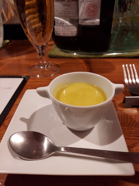 生ビールでスタートして、前回同様お通しは温かいスープ。