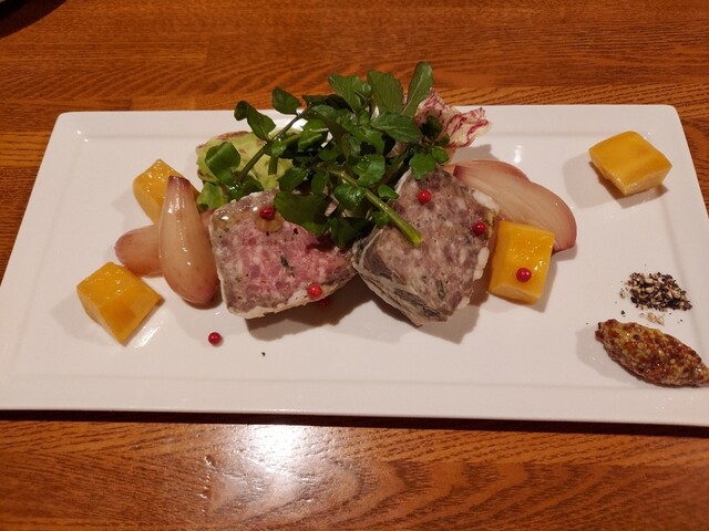 豚のパテドカンパーニュ、鶏のパテドカンパーニュ、11種類の野菜のテリーヌジェノベーゼソース、ホタテとキノコ