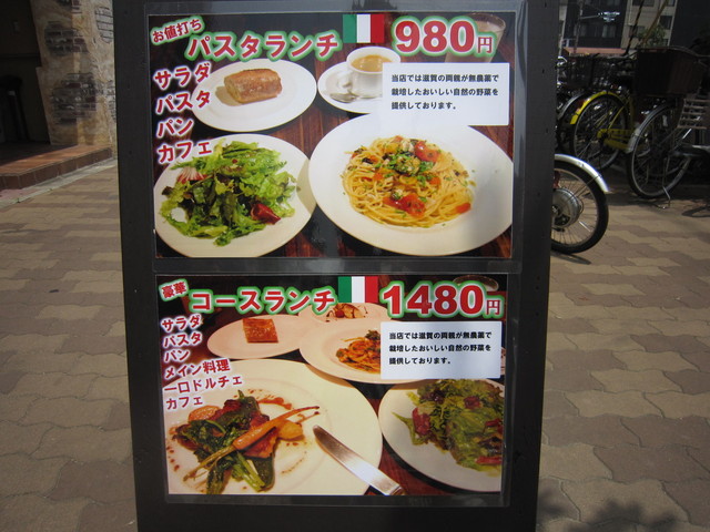 入り口の黒板に『当店は滋賀の両親が丹精込めて無農薬で栽培した野菜を提供して