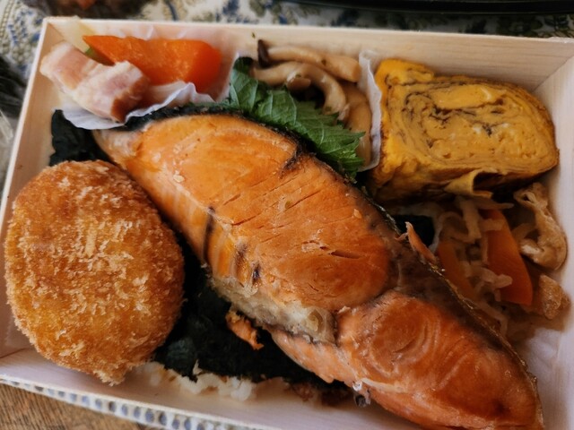 肉厚な鮭に卵焼き、4種類のおかずで豪華