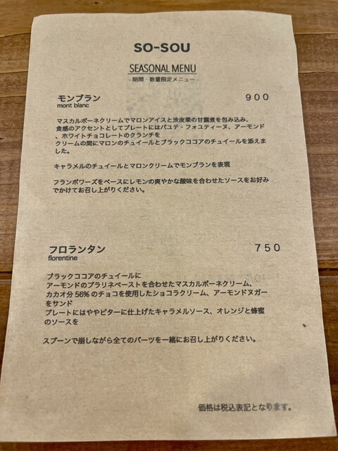 構成は、マロンクリーム、マスカルポーネクリーム、フランボワーズソースに浸したビスキュイ、ショコラメレンゲ、栗のロースト、ショコラチュイール。