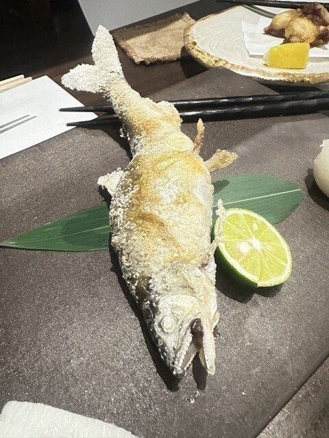 鮎の塩焼きなんですが、身が大きくて、人によっては好まない大きくなりすぎと揶揄する方もいますが、僕は骨ごと食べるので大きいの好きです笑
