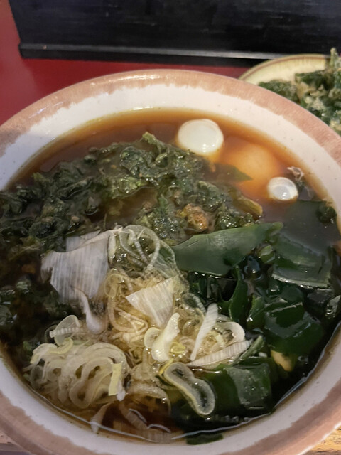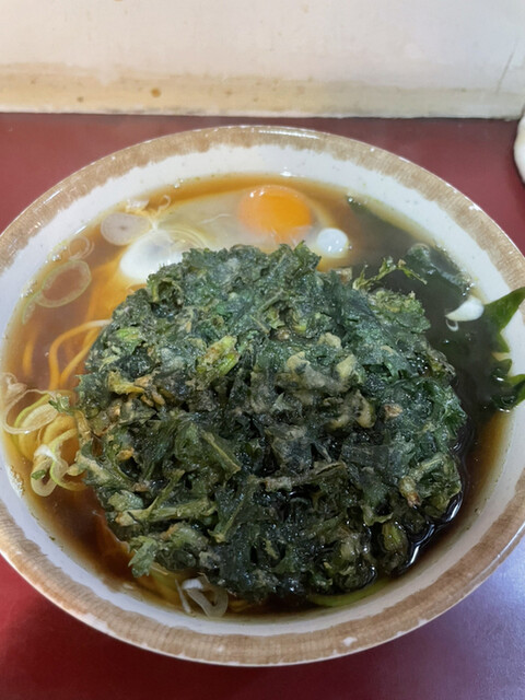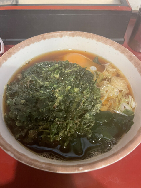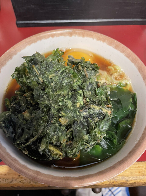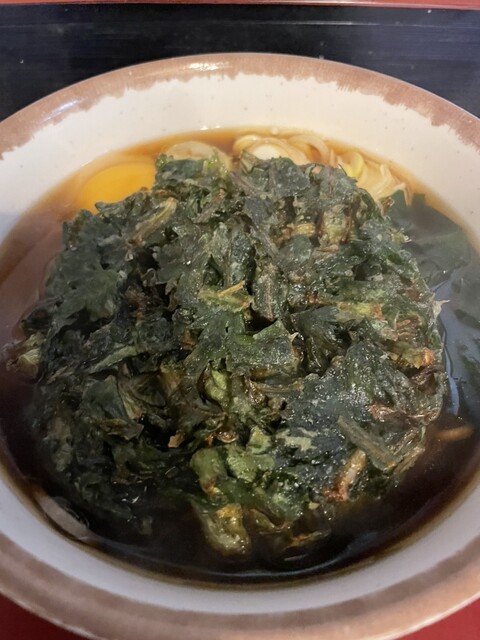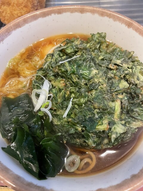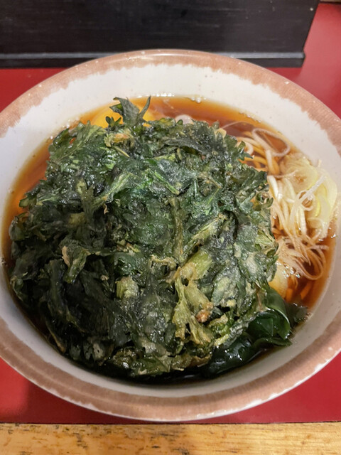 さて、立ち食いそば界のヒーローインタビュー お立ち台(春菊天そば)ですが、お立ち台(春菊天)は幾重にも重ねられた春菊で構成され、なんとも立ち心地の良い最高のお立ち台(最高に美味しい、絶品の春菊天)です!