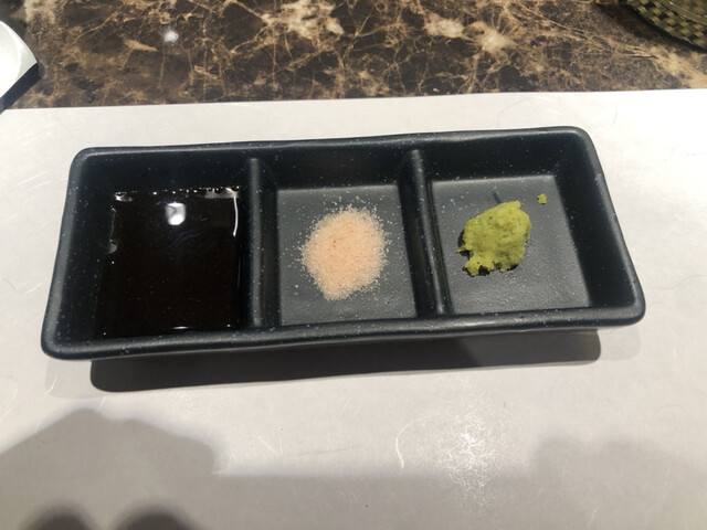 味は岩塩にワサビ、醤油と試せましたが個人的にはワサビ醤油の組み合わせが最高で一緒に出していただいたガリの炊き込みご飯との食べ合わせは最高でした。