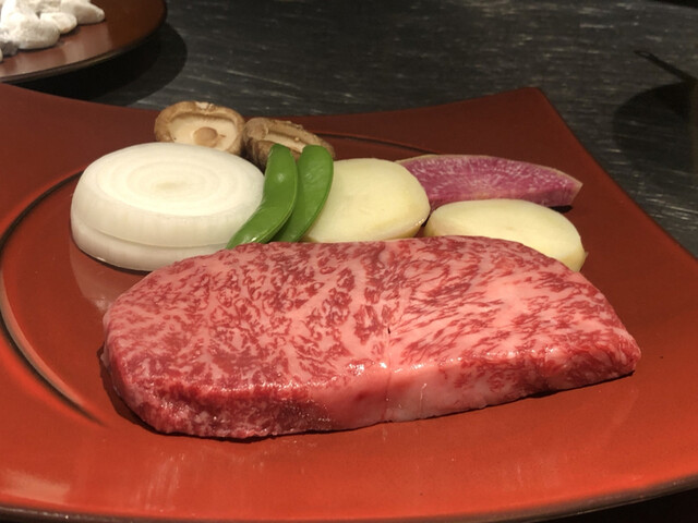 お肉と共に提供される季節野菜の鉄板焼きは特に焼きナスがお肉の旨味をたっぷり吸い込んでいてめっちゃくちゃ美味しかったです。